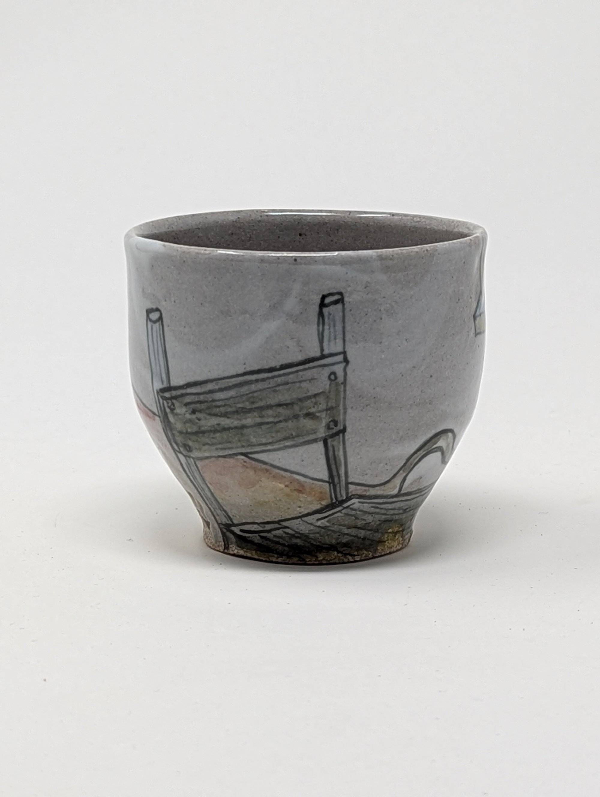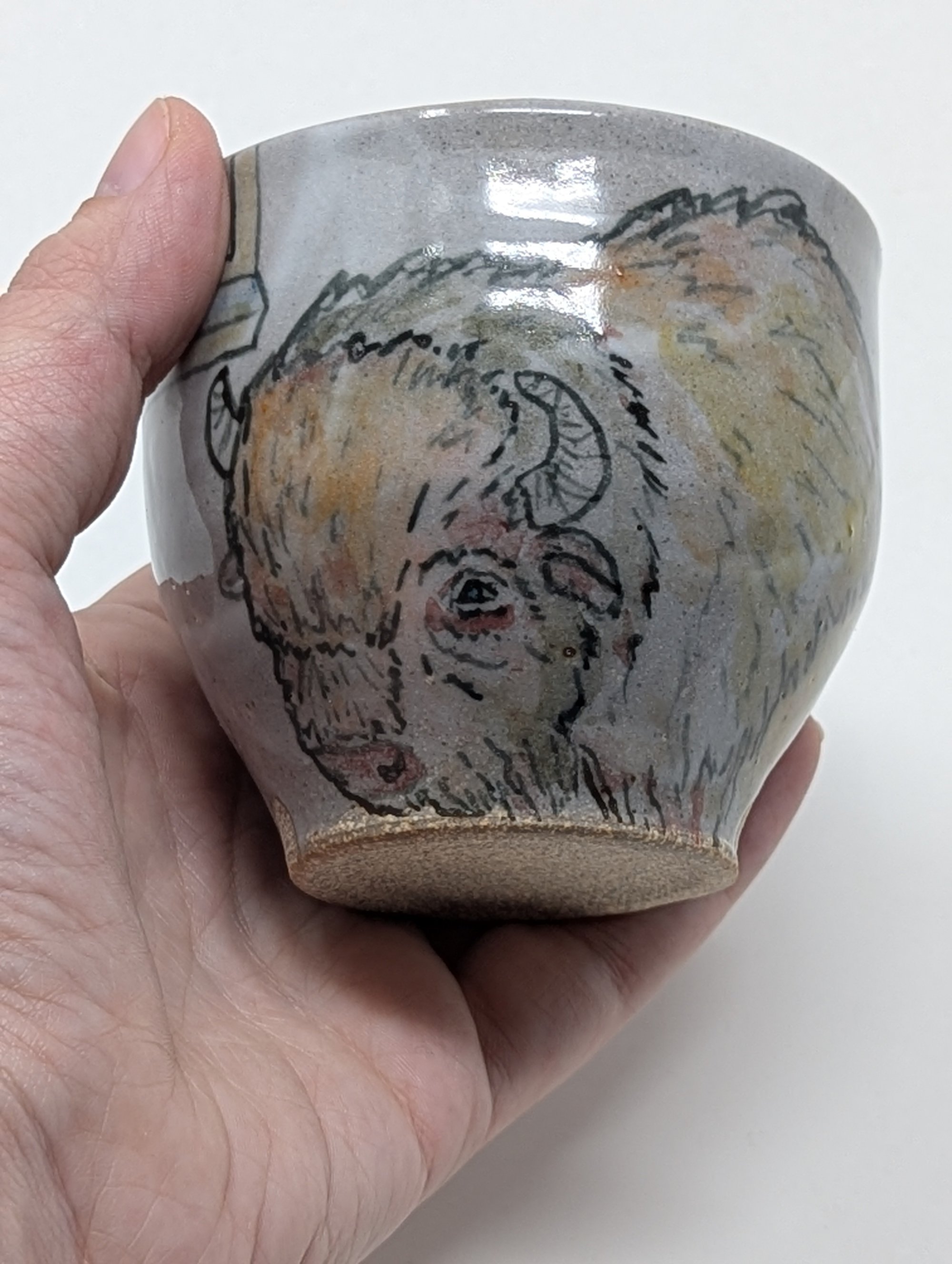 Wheel thrown, stoneware cup hand painted with mason stains. Fired to cone 10 in a gas kiln. Microwave and dishwasher safe. Approx. 3" tall and 3" wide.