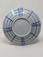 Wheel thrown, porcelain plate hand painted with cobalt stain. Fired to cone 10 in a gas kiln. Microwave and dishwasher safe. Approx. 7.5" wide.