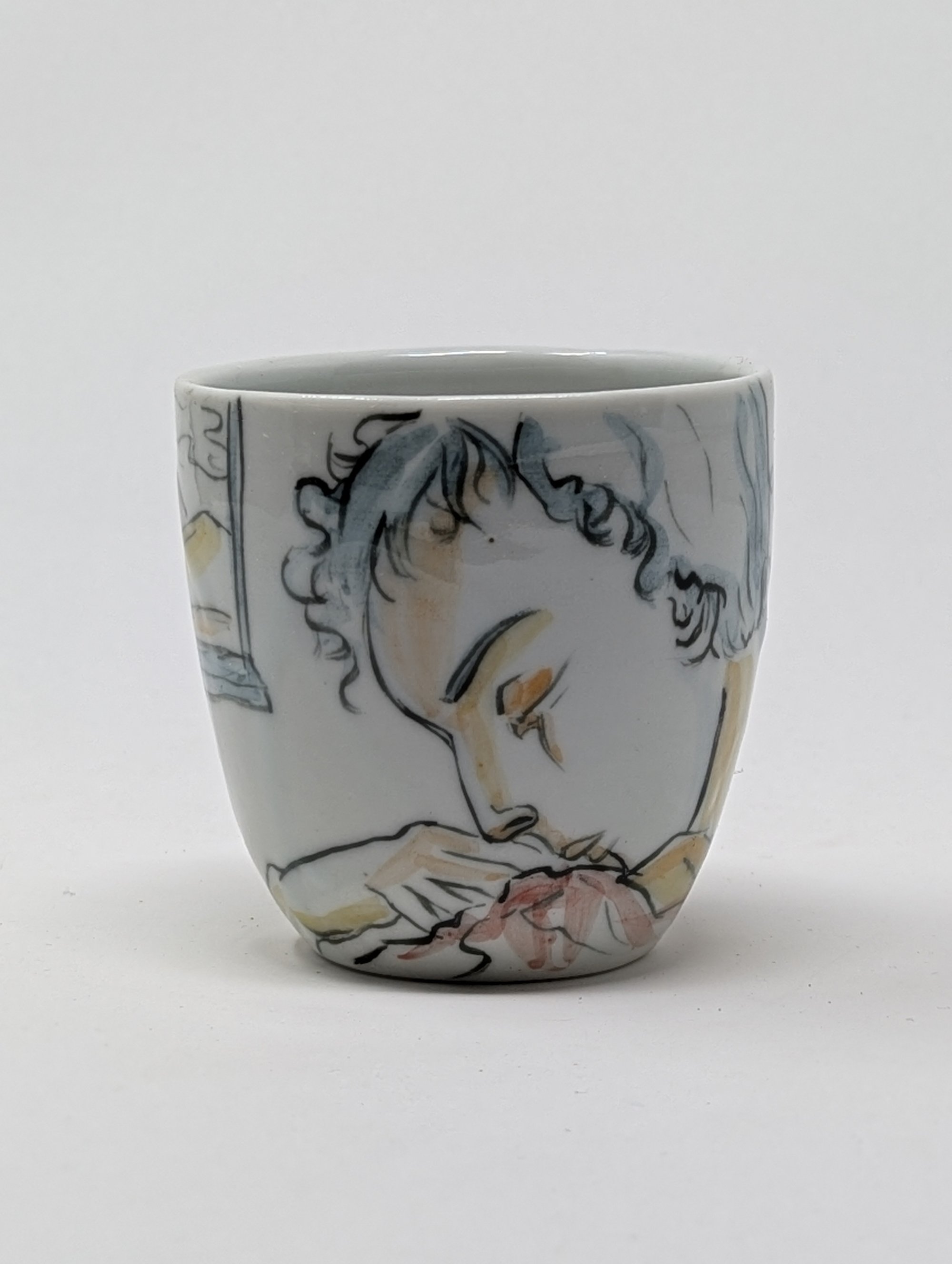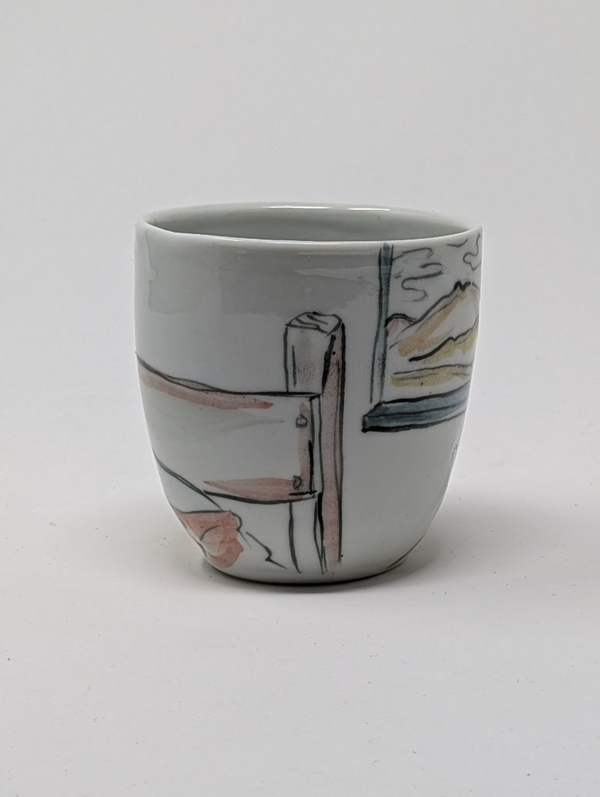 Wheel thrown, porcelain cup hand painted with mason stains. Fired to cone 10 in a gas kiln. Microwave and dishwasher safe. Approx. 3" tall and 3" wide.