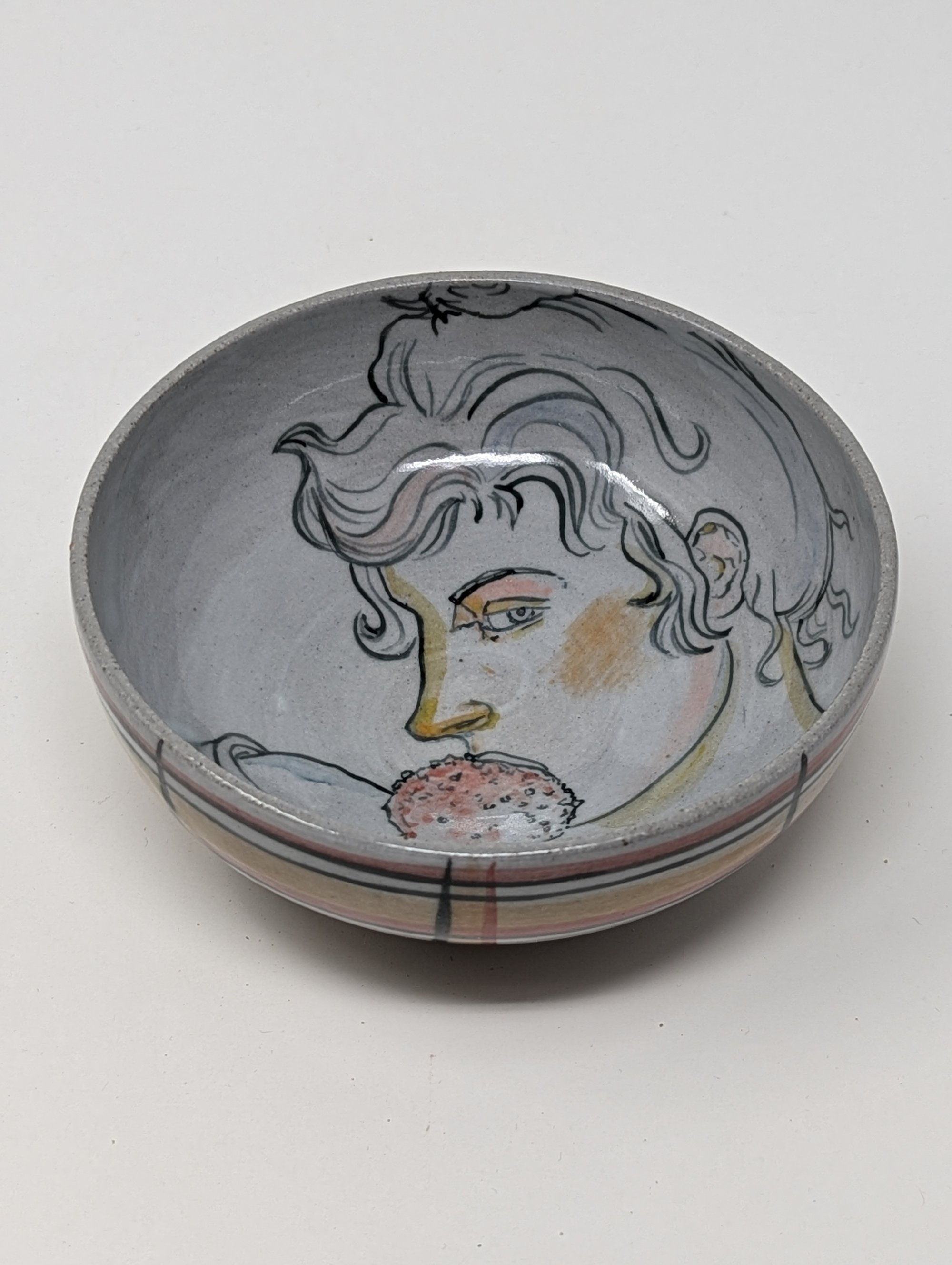 Wheel thrown, stoneware bowl hand painted with mason stains. Fired to cone 10 in a gas kiln. Microwave and dishwasher safe. Approx. 5.5" wide and 2.5" tall.