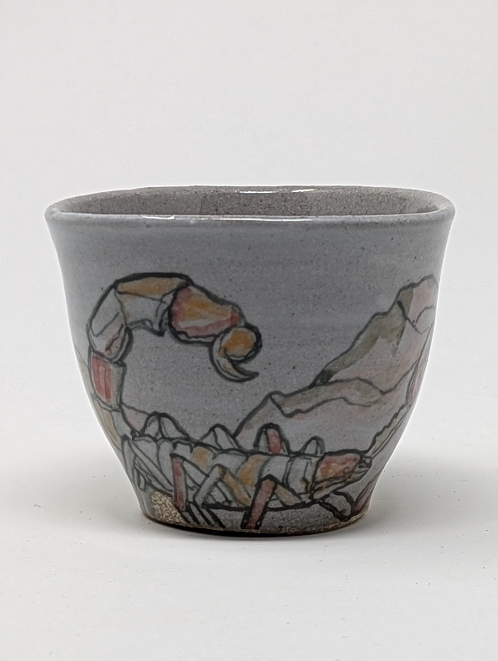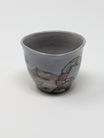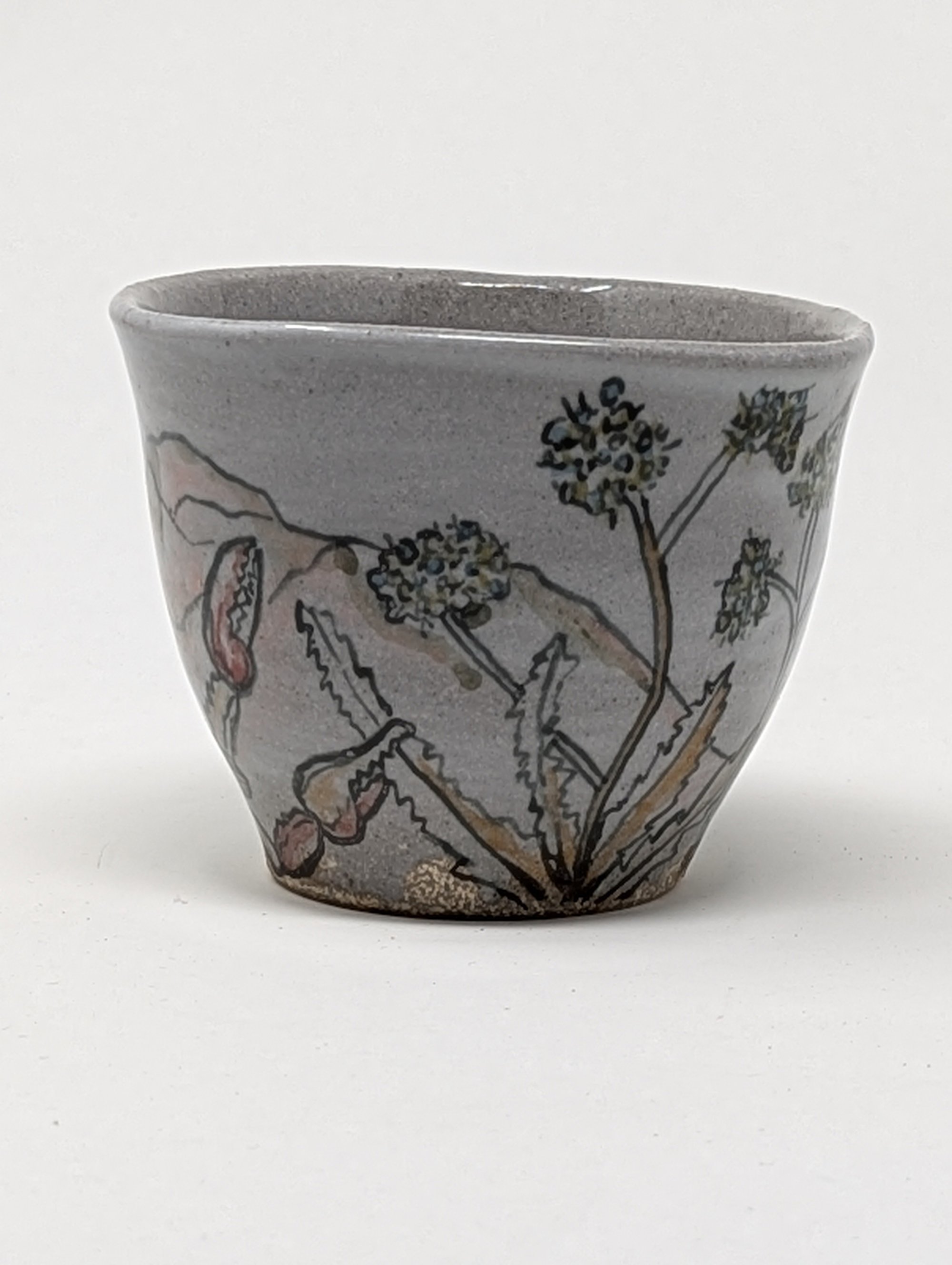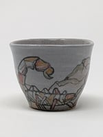 Wheel thrown, stoneware cup hand painted with mason stains. Fired to cone 10 in a gas kiln. Microwave and dishwasher safe. Approx. 3" tall and 3.75" wide.